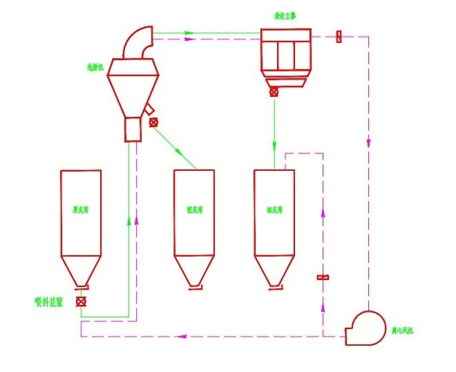 原灰經(jīng)氣力泵送入粉煤灰選粉機,經(jīng)選粉機分選后,細灰隨氣流進入在另一庫頂布置的布袋收塵器收集,經(jīng)卸灰閥至細灰?guī)。粗灰從選粉機粗粉口排入粗粉庫。